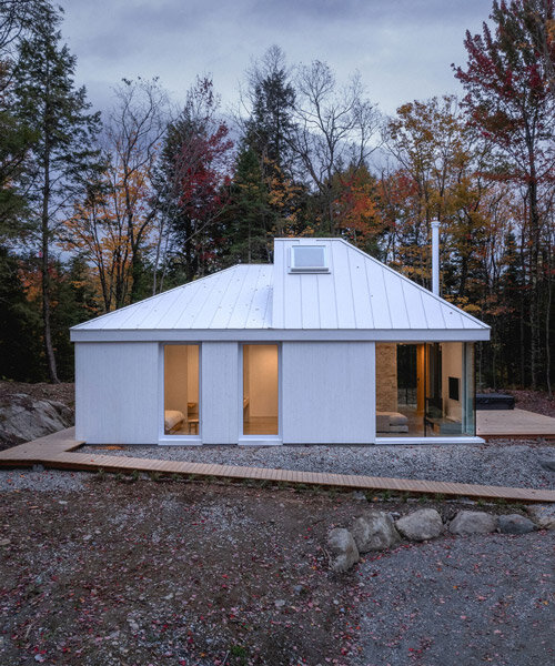 the minimalist exterior uses wooden planks, large windows, and a metal roof